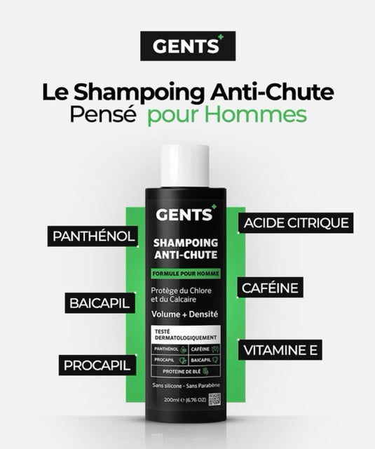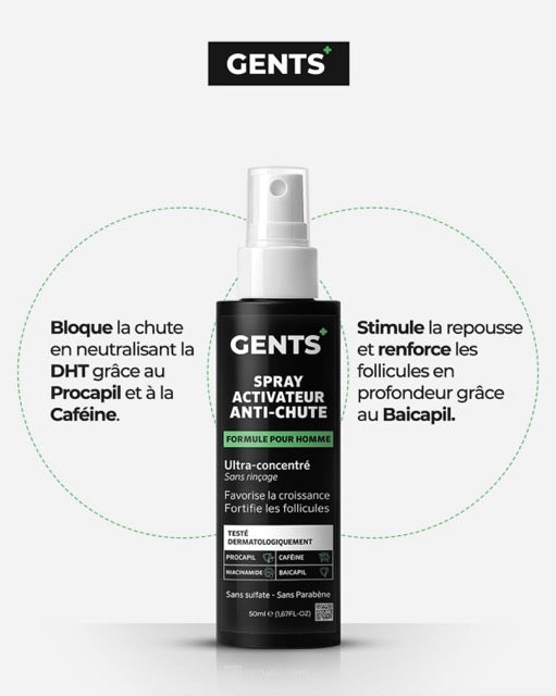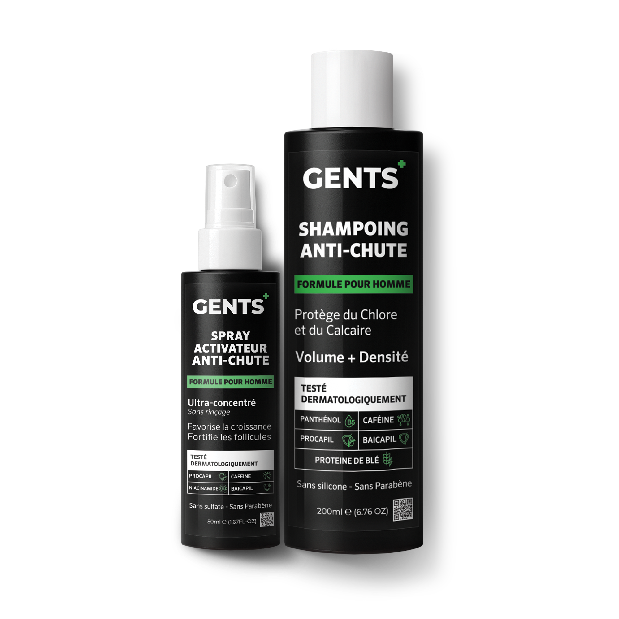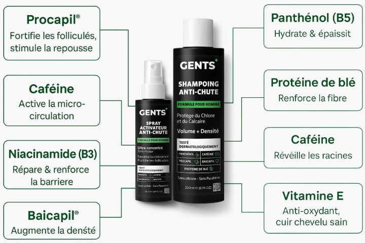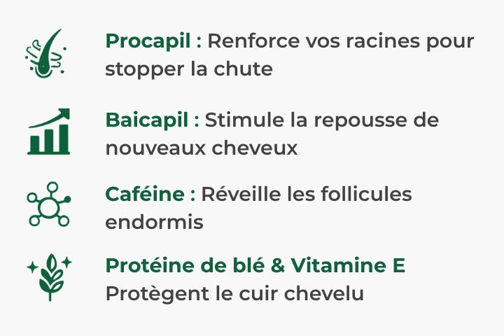 Procapil® bloque l’action du DHT → freine la chute. Caféine & Niacinamide → activent la micro-circulation et fortifient la fibre.